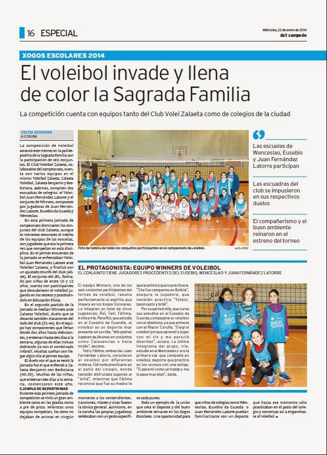 Os dejo mi segundo reportaje para el dxtcampeón sobre los Xogos Escolares centrado esta semana en la competición de voleibol. Gracias al Club Voleibol Zalaeta por las facilidades y a todos los equipos y participantes por su generosidad.
